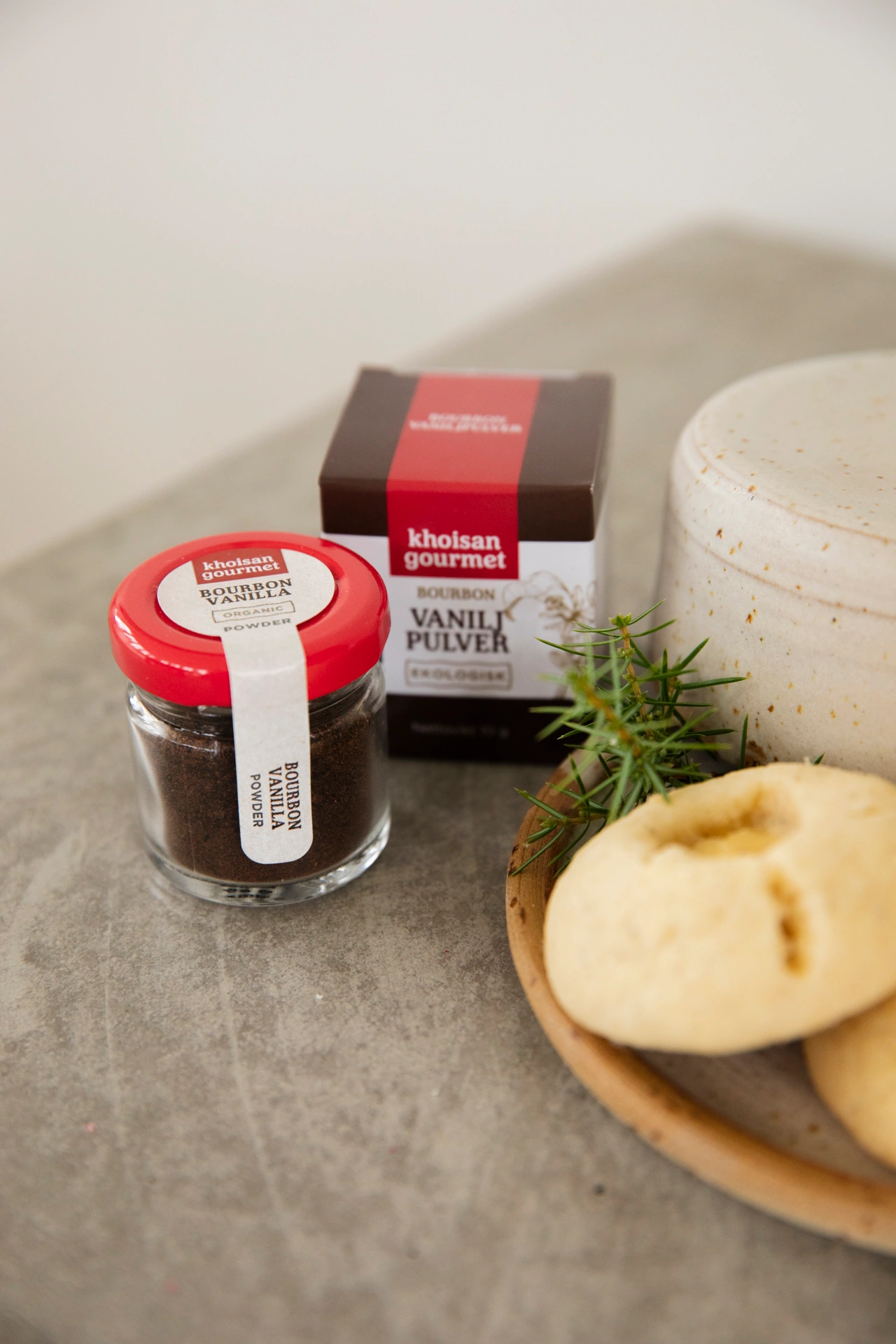 Khoisan Gourmet Bourbon vaniljpulver EKO är vaniljpulver av högsta kvalitet med fantastiskt söt och fyllig vaniljsmak. Den passar perfekt till alla typer av bakning, desserter och smoothies! Khoisan Gourmet Bourbon Vaniljpulver är gjord på 100% finmald Bourbonvaniljstång.