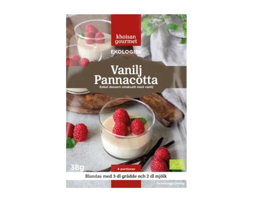 Vår ekologiska vaniljpannacotta är en bakmix som du blandar med grädde och mjölk för att få en enkel dessert smaksatt med vanilj.