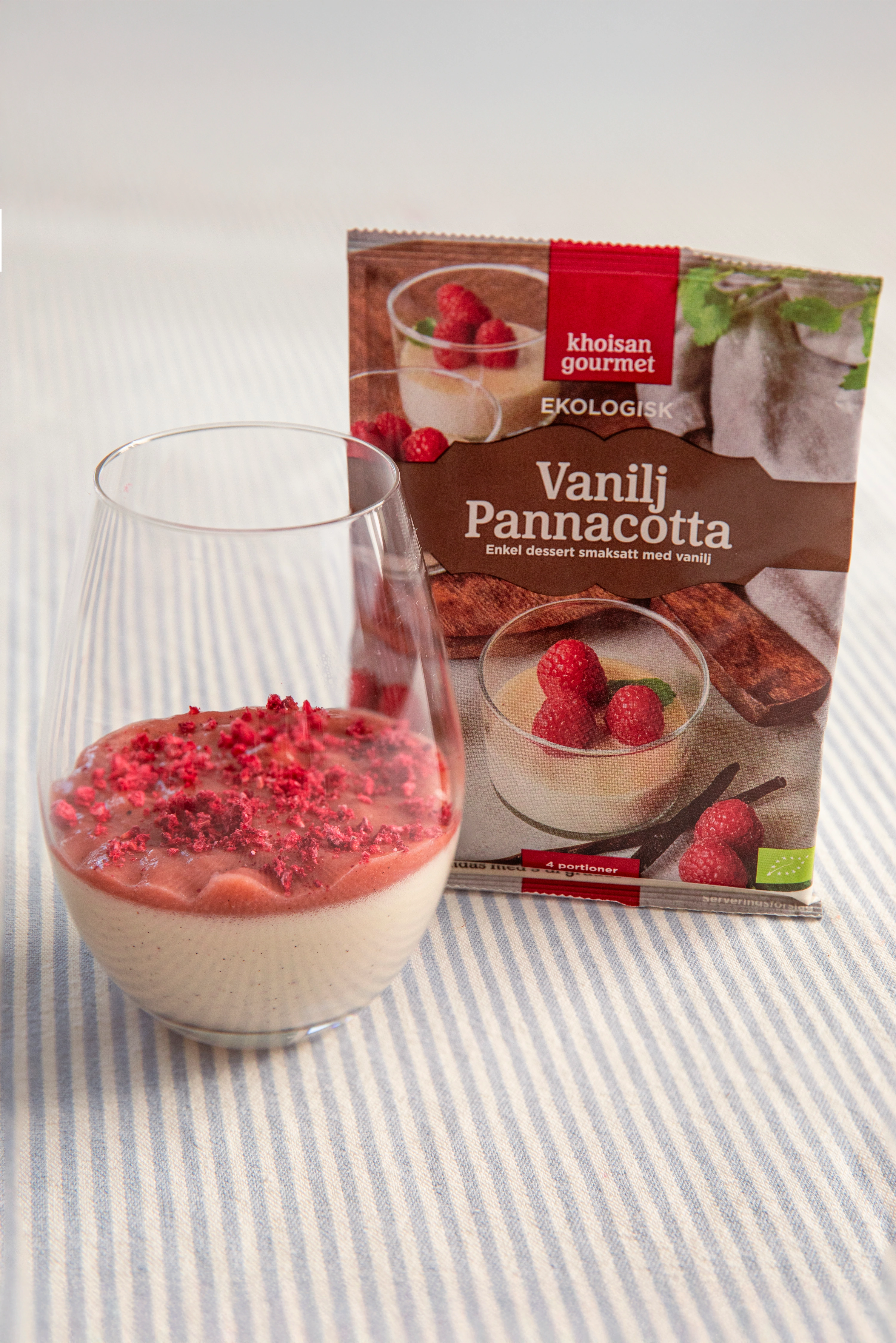Vispa ner påsens innehåll tillsammans med 2 dl kall mjölk och 3 dl grädde i en kastrull. Låt stå i 2 min. Koka upp och låt koka i 2 min under konstant omrörning. Ta kastrullen från plattan och låt svalna i 5 min under fortsatt omrörning. Fördela i 4 st portionsformar och låt svalna i kylskåp i minst 2 timmar innan servering. Servera pannacottan direkt ur formen och toppa med färska bär eller frukt.