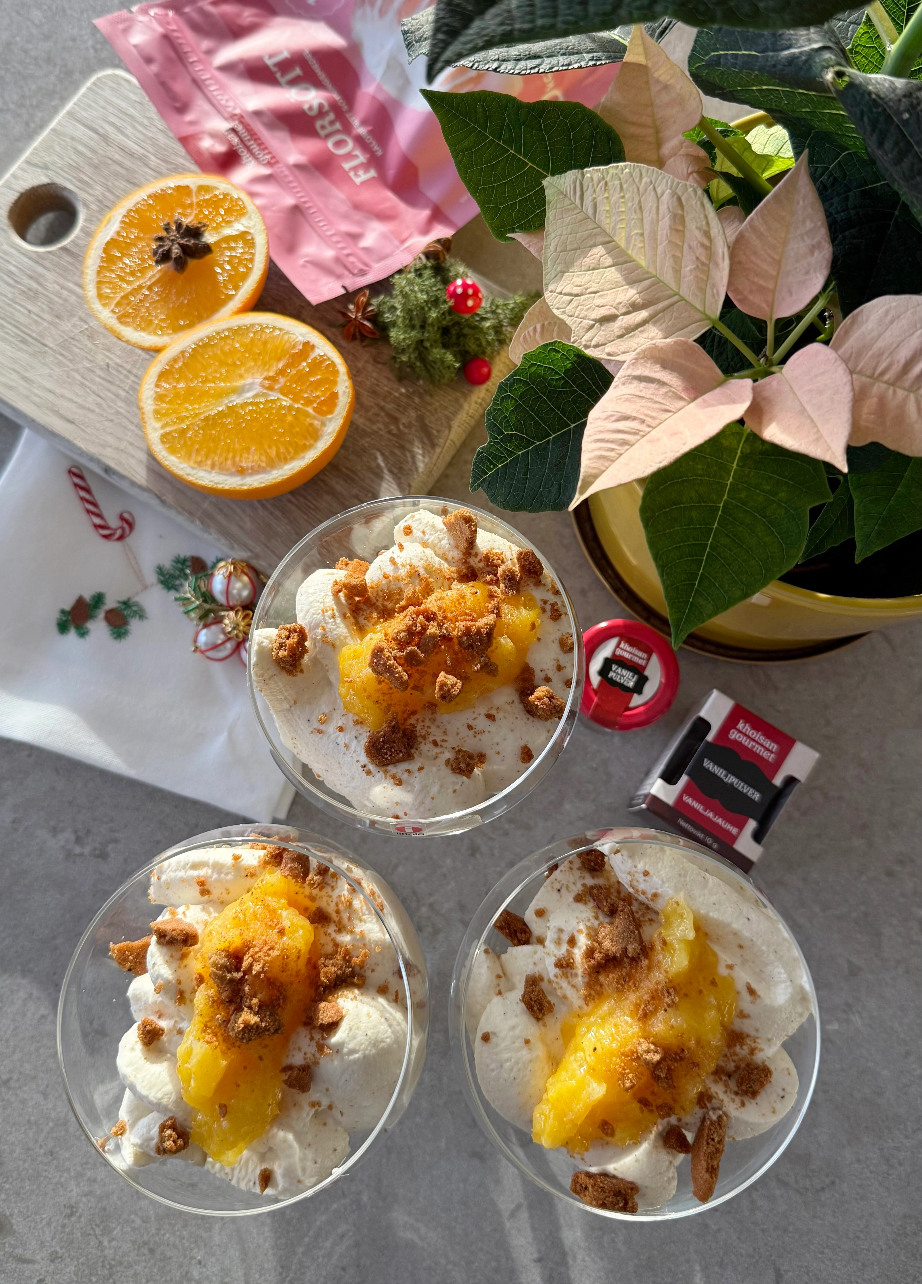 Fluffig vaniljmousse med apelsinkompott & pepparkakscrunch