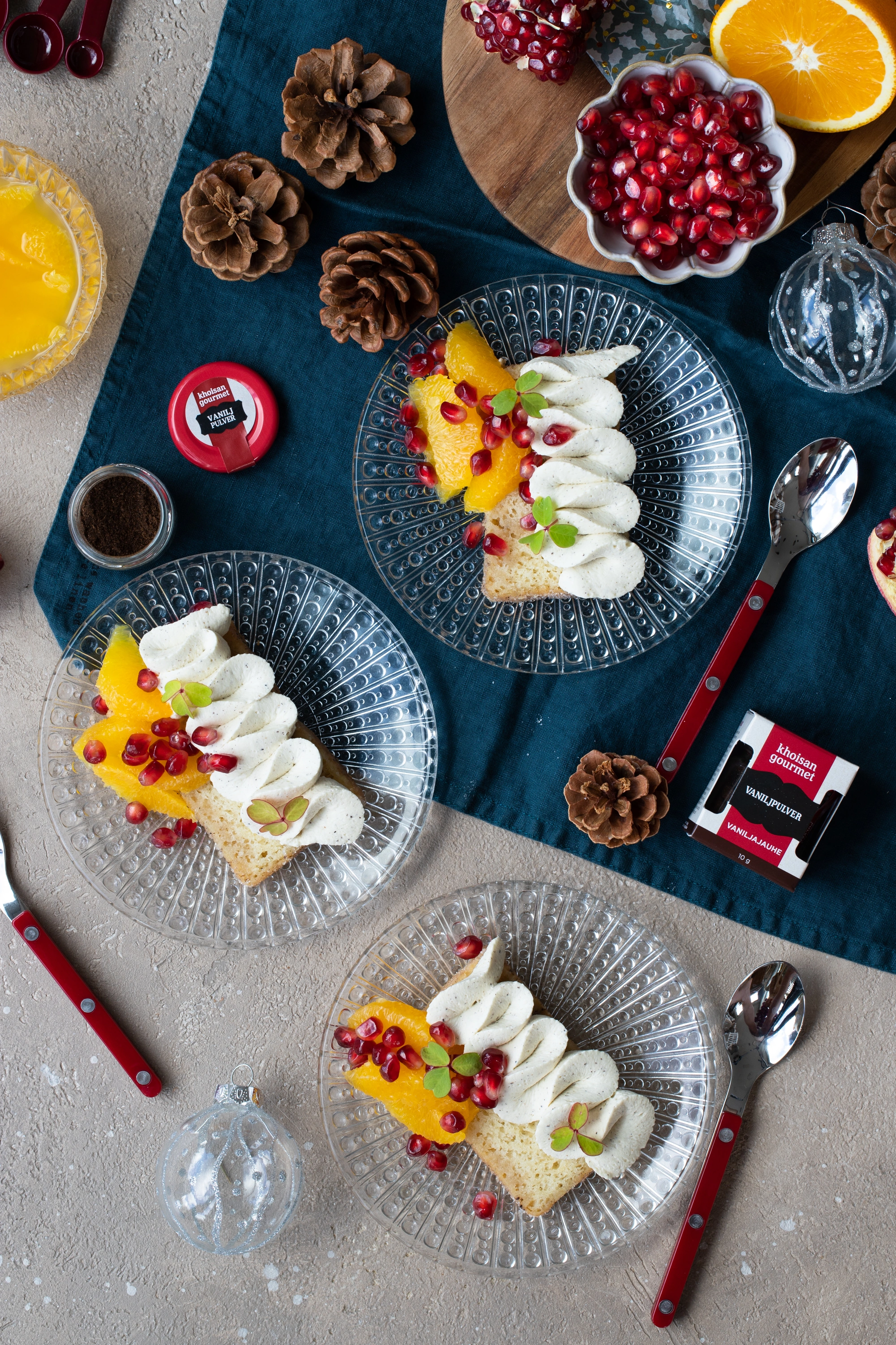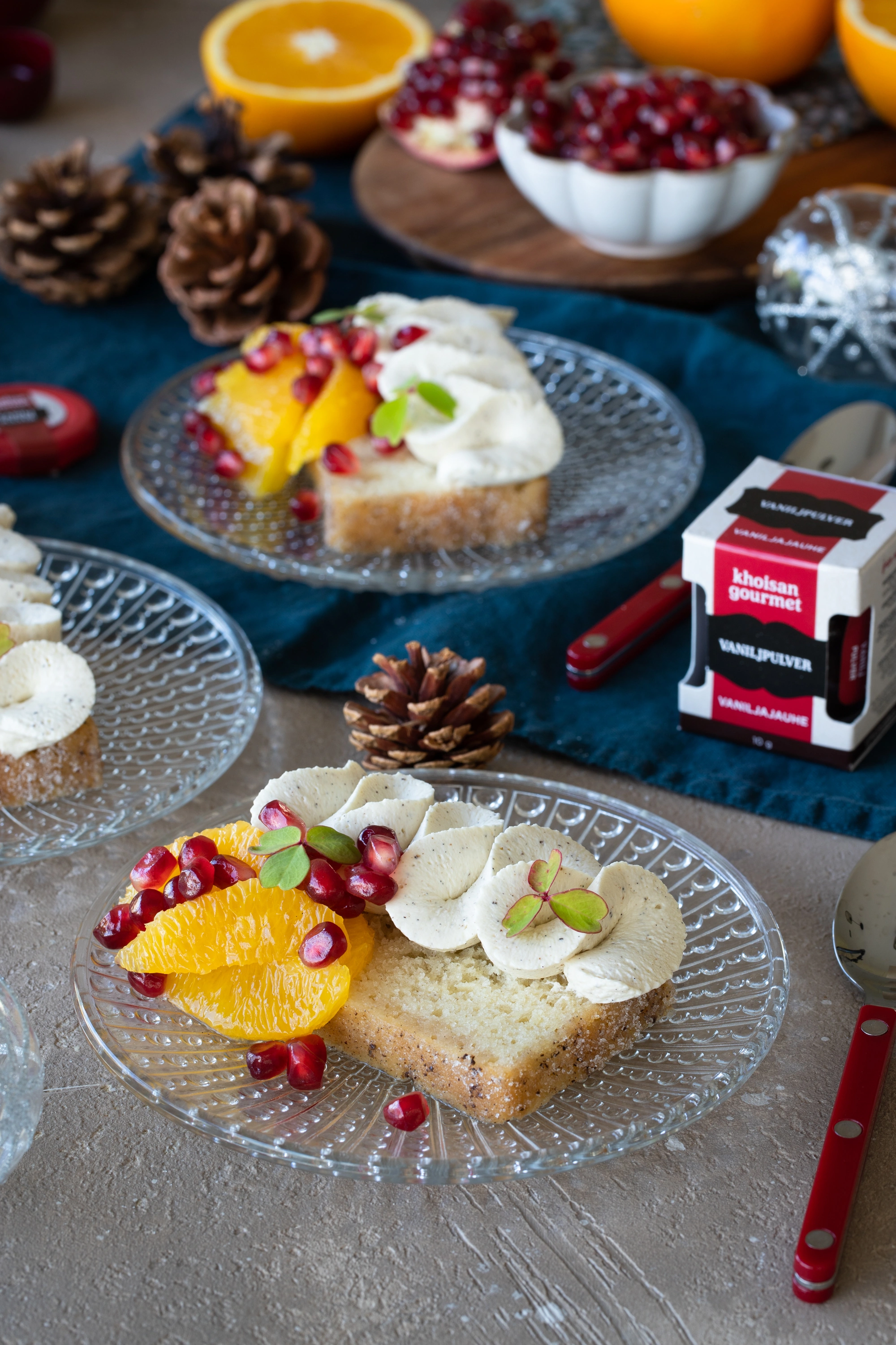 Filéa apelsinen och lägg några klyftor på varje kaka. Strö över granatäpplekärnor.